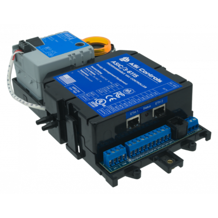 The ASIC/3-6115-ETH Dual-Ethernet Airflow Controller from ASI Controls is a powerful, fully programmable VAV controller designed for modern building automation networks. Combining advanced airflow control with an integrated dual-port Ethernet switch, the 6115-ETH simplifies network design while delivering precise, scalable HVAC control for commercial applications.
